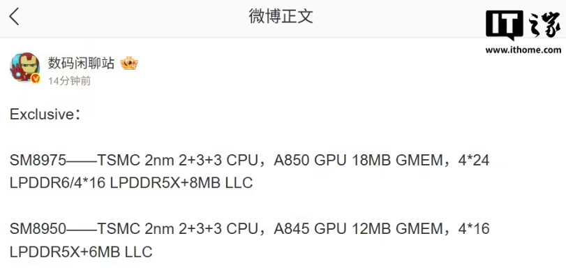 博主 @数码闲聊站 爆料了 SM8950 和 SM8975 两个版本的配置。